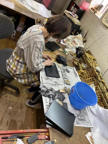 納骨壇作成にあたっては下地作りが最も重要です。黒く塗っては研ぐを何度も繰り返して、下地をしっかりと作ることが、高品質な納骨壇作りに欠かせない作業です。